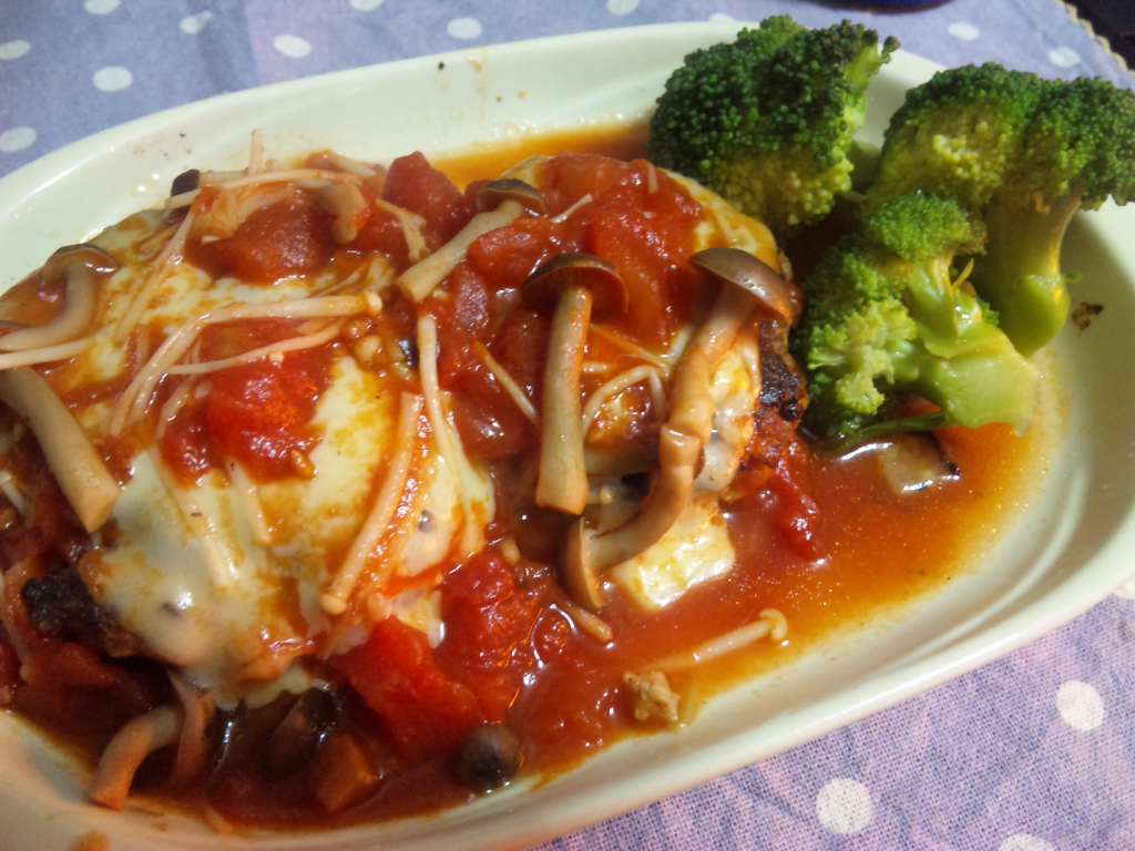 ミンチと豆腐のチーズハンバーグ、トマトソース仕立て。